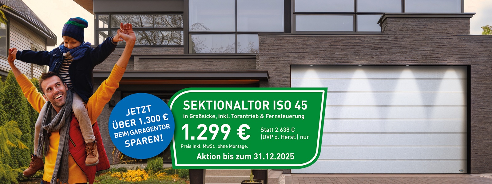 Erleben Sie größte Vielfalt, bestmöglichen Komfort, höchste Sicherheit und neu besonders hoher Wärmedämmung mit Premium-Sektionaltoren mit 45 mm Dämmung! Bis zum 31.12.2025 zum attraktiven Aktionspreis von nur 1.299,- Euro inkl. 19% Mwst. (ohne Montage) / statt 2.638,- Euro (UVP des Herstellers)!